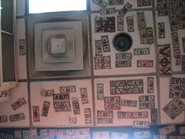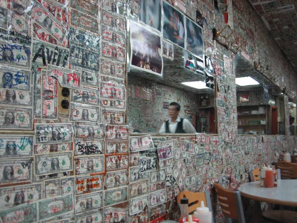 それで見つけたのがこの『69 Chinese Restaurant』。『69』って、なんかいやらしいなぁと思ってたが、単純に番地が69ってだけらしい。内装が面白かった。壁も天井も、一ドル札に、客がサインや寄せ書きをしたもので貼りつくされてる。ちなみに今日はデジカメ持って出るの忘れたんで、写真はHeron Preston氏のブログからの使用許可をいただいた。