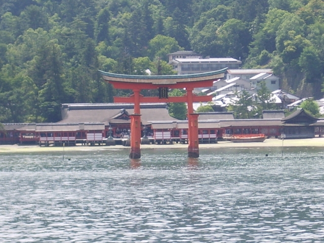 宮島口から宮島へのフェリーは、厳島神社の鳥居の近くを通ってくれる。同社殿は1168年ごろ平清盛の命令によって造られたらしく、1996年に世界遺産に登録された。