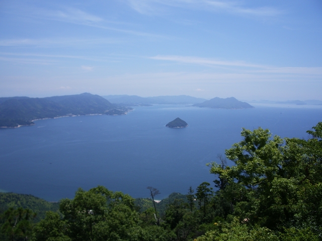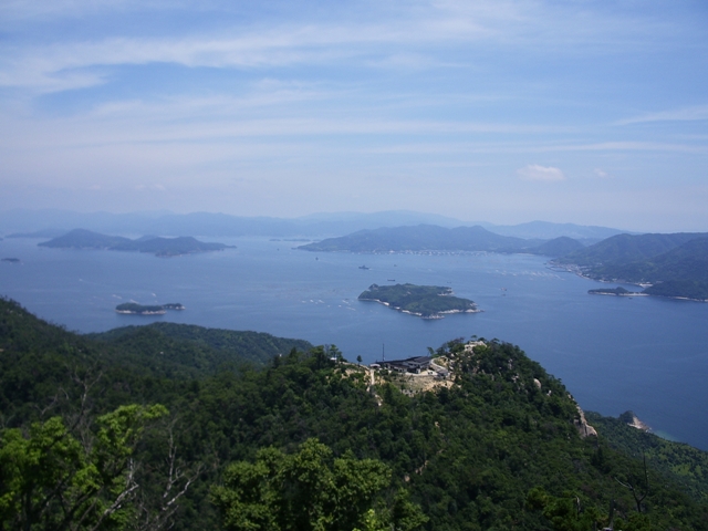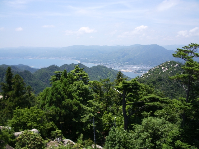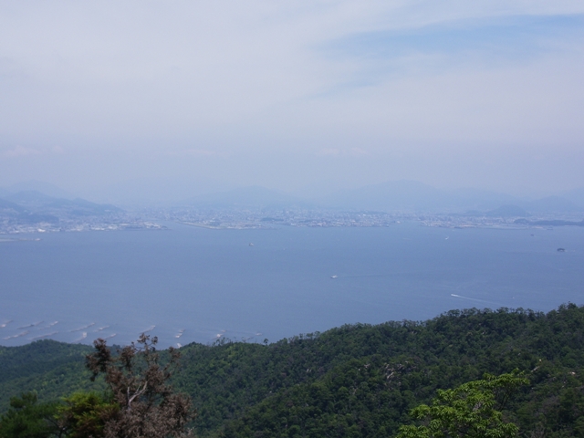 ロープウェイの終点で、「上まで登ると、瀬戸内海が360度眺められるよ」と言う係員のおっさんにそそのかされて、弥山を登る。1kmくらいだとは聞いてたが、なんか、最初の300m、ずっと下っていったんで、心配してたら、案の定、後の700mは登りっぱなし。汗ダラダラなんてもんじゃない。でも途中まで来たから、引き返すのも勿体無い。