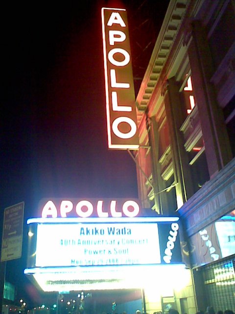 先日からコンサート続きだが、今夜は夫婦でハーレムまで。あの黒人音楽の殿堂、アポロ劇場で、なんと和田アキ子がデビュー40周年記念コンサートを開催するとか。実はCD持ってたりするし、歌手としては嫌いじゃない。芸能界で威張ってるとか、性格が悪いとか、よく聞くけど、その辺はやはり自分も猪木ファンだけあって、個人的に関わらなくていい限りは、結構楽しんでたりする。